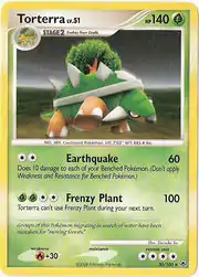 Earthquake and Frenzy Plant are both moves in the Pokémon games that Torterra can learn, the latter only via Move Tutor. This card's Pokédex entry comes from Pokémon Pearl.