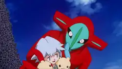 Meanwhile, Rayquaza had finally blasted its way through the force field surrounding the city and attacked the two Deoxys. With the force field gone, the power in the city was restored, and the ensuing fight between the Deoxys duo and Rayquaza caused the city's Block Bots to malfunction catastrophically. Acting on instructions from Professor Lund, Tory, Ash, Pikachu, Plusle, and Minun, set to prevent the oncoming disaster. When Ash lost his passport, which he needed to stop the out-of-control robots, Tory threw him his own; Ash succeeded. As the security system finally shut down, Tory, Plusle, and Minun found themselves suspended high on top the Battle Tower. Plusle and Minun began to fall, but Tory dove after them and grabbed them as all three of them plunged. Fortunately, the trio were saved by the second Deoxys, and Rayquaza, who had reconciled with the Deoxys, rescued Pikachu (who had previously fallen into the block bot swarm after sacrificing himself to help Ash), and then returned to the ozone layer.