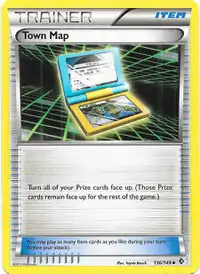 Town Map was introduced as an Item card in the Pokémon Trading Card Game during the English Black & White Series (the Japanese BW Era). First released in the Japanese Freeze Bolt expansion, it later debuted in English in the Boundaries Crossed expansion, with both prints featuring an illustration by Toyste Beach. This Trainer card allows the player to flip their Prize cards face-up for the remainder of the game.