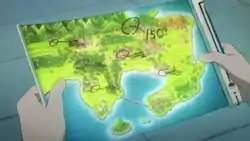 In Dreams by the Yard Full!, similar to Max with his PokéNav in Pokémon the Series: Ruby and Sapphire and Brock with his Pokégear in Pokémon the Series: Diamond and Pearl, Cilan is shown to have a Town Map for his journeys with Ash and Iris. It seems to have the ability to look up and locate various landmarks and natural occurrences as seen in Cottonee in Love! when Cilan uses it to track the flow of the wind, and in Facing Fear with Eyes Wide Open! when he locates plants used for an antidote for poison at the bottom of a lake.