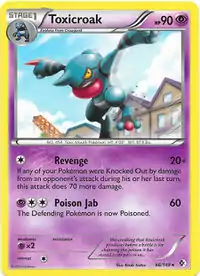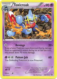 Revenge and Poison Jab are both moves in the Pokémon games that Toxicroak can learn. This card's Pokédex entry comes from Pokémon Black 2 and White 2. Virbank City is featured in the Boundaries Crossed illustration.