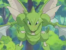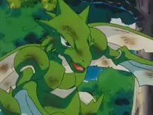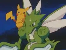 On the day Tracey decided to leave the group and become Professor Oak's assistant, he used Scyther to help save Pikachu who was taken by Team Rocket by slashing open the case that he had been trapped in. Once saved, Pikachu happily hopped up on Scyther's shoulder as a show of thanks.