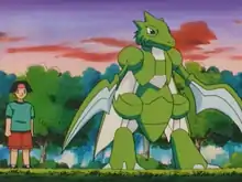 In A Way Off Day Off, Tracey decided to introduce the group's Pokémon to Scyther, although all of them were afraid of it. They quickly warmed up to it after seeing that Togepi was not scared of it. However, Charizard had no interest and nearly hit Scyther with Flamethrower. This caused a small rivalry between the two Pokémon. Scyther then warded off Ash's hungry Snorlax from devouring the group's food. They were able to set aside their differences to alert their Trainers that Team Rocket was trying to steal their Pokémon. Scyther was also able to send Team Rocket blasting off with Skull Bash.