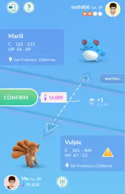 In Pokémon GO, a trade is a process by which a player sends one of their Pokémon to one of their Friends in exchange for one of that Friend's Pokémon. Introduced in June 2018,[1] it is equivalent to the trade mechanic in the core series games. While trading is not required to complete the Pokédex, as it is in the core series, it is one of the methods that allows players to add new registrations to their Pokédex without catching Pokémon directly. (The other method is through hatching Eggs.)