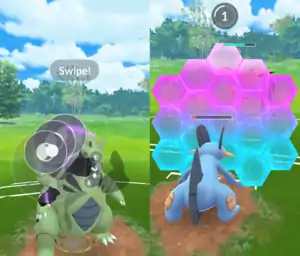 Once the Charged Attack meter is full, the player can tap the icon to cast a Charged Attack. Activating a Charged Attack will initiate a five-second minigame in which type icons start appearing on the screen in a pattern specific to the Charged Attack's type. The more icons the player manages to swipe, the more damage the Charged Attack will deal. Since February 15, 2019, certain Charged Attacks may increase the user's stats after use; on March 19, 2019, Charged Attacks that may decrease the target's stats were also introduced.