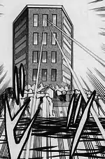 In Pokémon Adventures, Trainer Tower is a Team Rocket base controlled by R (Japanese: r), a computer created by Carr. It is equipped with 3D projectors, different sorts of weapons, and a restraint system that is almost completely immune to all kinds of Pokémon moves.
