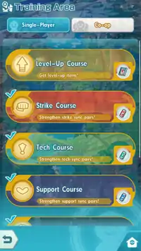 The training area had a major change with update 1.12.0 and now consists of various areas that allow the player to obtain specific items such as Skill Spheres. With the update, the co-op mode Special Training and EX Challenges were moved to the EX Plaza. Courses, supercourses and single-player Special Training were entirely removed. If a rally is active, it now gives the player increased rewards for each battle.