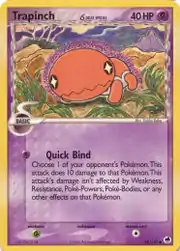 Trapinch δ (Japanese: ナックラー δ Nuckrar δ) is a Psychic-type Basic Pokémon card. It is part of the EX Dragon Frontiers expansion.