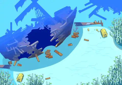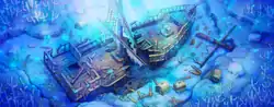 A wrecked ship occupies north-west part of Treasure Sea. Planks of wood and two treasure chests are scattered around the rest of the area. Beams of light radiate down from the surface.