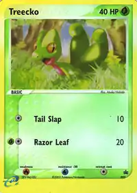 Tail Slap is a move later introduced in the Generation V Pokémon games that Treecko cannot learn; however, the Japanese names are not the same, making this attack and the move unrelated. Razor Leaf is a move in the Pokémon games, though Treecko cannot learn it. This card's e-Reader Pokédex entry comes from Pokémon Sapphire.