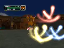 Dodrio opens its beaks and positions its heads so that each beak becomes a corner in the shape of a triangle. An orb of energy then forms inside Dodrio's beaks, the right one colored green, the top one indigo and the left one red. A red triangle then forms in between the orbs. Once the triangle starts to turn indigo, Dodrio fires the triangle at the opponent. | ||