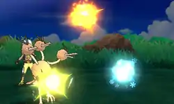 Alolan Dugtrio spins around, sometimes rapidly, then an orb of yellow electric energy, light blue ice energy, and orange fire energy form around Alolan Dugtrio. Each of the heads then fires an electric, ice, and fire attack, from each ball respectively at the opponent. | ||