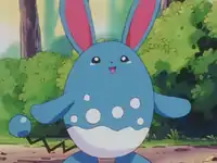 Trixie noticed that Azumarill had been behaving differently, even refusing to perform, since Golduck had joined the circus troupe. Her diva behavior continued when she stormed off-stage during her ball-juggling water performance, mainly because Totodile had leaped onto the stage. Later, Azumarill was captured by Team Rocket. Ash and his friends tried to help it, but Pikachu was captured too. Team Rocket tried to get her to juggle, but she refused their pleas. Suddenly, Totodile appeared but was captured too. At night, Totodile gave Azumarill her lost ribbon back, making her slightly happy. The next day, Ash and his friends found Team Rocket, and Trixie's Golduck was able to send them blasting off with a powerful Water Gun. Azumarill was freed from her cage, and it ran towards Golduck, dodging Totodile and hugging Golduck instead. Trixie understood that Azumarill had developed strong feelings of affection for Golduck, and soon after, Azumarill returned to her normal self. In the English version, Azumarill was repeatedly referred to as a female. Azumarill's only known move is Water Gun. | ||