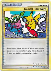 For each primary iteration of this card, a nine-card commemorative collection was given to participating players at the start of the tournament. The collection consists of seven prints of Tropical Tidal Wave in English, Japanese, French, German, Spanish, Portuguese and Italian, along with two special cards featuring a themed design of the current World Championships; one advertising the forthcoming World Championship Decks and one advertising the date and venue for the following World Championships. Special stamped versions of the English print were also awarded to staff who helped oversee the event and to the top-ranking players in each division of the tournament. All Worlds 2010 prints of this card are numbered HGSS18 with the exception of the Japanese print, which is an unnumbered L-P Promotional card.