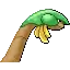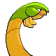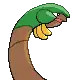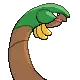 Tropius is a large, sauropod-like Pokémon with a brown body wrapped in green leaves on its chest and head. It possesses large, broad green leaves on its back, which it uses for flight and for sugar production via photosynthesis. Despite being very big and bulky, it is surprisingly maneuverable in the air. It has a long neck with a thin black line around it. It uses its neck for reaching treetops to gorge on its most favored fruit. Since it ate only this kind of fruit continuously, the fruit began to grow around its neck. These yellow, banana-like fruits can be picked and consumed by other Pokémon or humans, and grow twice a year because of the rapid production of sugar in Tropius's leaves. Its feet have toenails the same color as its fruit.