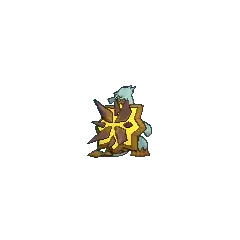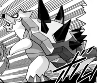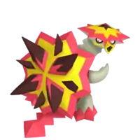 This Pokémon resides on volcanoes, where it camouflages itself among the rocks and waits for prey. In addition to hunting, Turtonator also feeds on sulfur and other volcanic materials. This diet rich in explosive material has contributed to a layer of explosive material in its shell. This diet also makes Turtonator's feces dangerously explosive. The feces can be put to many different uses; in Pokémon Adventures, they can be used as makeshift landmines, exploding from a mere touch. When prey steps onto its shell, it strikes itself with its own tail to cause an explosion. The explosion is ignited by sparks from the spikes on its shell and released through the hole on its chest.[1] This orifice also acts as Turtonator's weak point. Its explosive capabilities are dampened by the rain, however, so it takes refuge in caves on rainy days. It is also capable of spewing poisonous gas and flames from its nostrils.