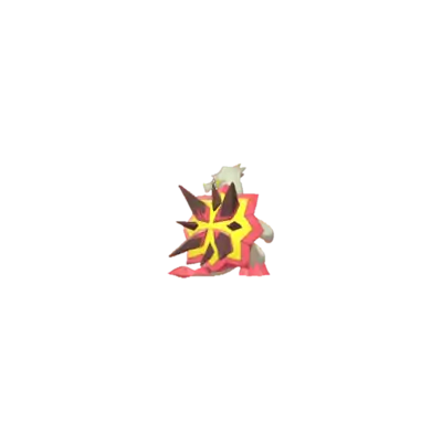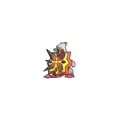 Turtonator is a bipedal, turtle-like Pokémon with a spiny shell. Its skin is a muted green and only visible on its limbs, tail, head, and neck. On top of its head is an additional shell with many points around the brim. This extra shell has a black center, yellow in the middle, and a red outer rim. Its eyes have black markings around the bottom, and it has a tubular, yellow snout with a single, large nostril. Turtonator has a wide mouth with the lower lip marked by a jagged yellow line extending from its nose. On each side of Turtonator's long neck are two short, triangular projections. Its front legs have mitten-like hands, while its hind feet have claw-like red growths around them. Most of its tail is also covered by red plating, which has fin-like projections. The shell that encases its body has a red underside with a star-shaped, yellow-rimmed hole in the center. The back of the shell has a yellow center with several spikes: four large spikes with red bases form a star shape in the center with four smaller spikes around them.