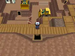 The Ice Rock is located in the lowest floor of the mountain, accessible from the central construction site. If an Eevee is leveled up on this floor, it will evolve into Glaceon. Located in the tunnel immediately before the Ice Rock is a Worker who will give the player a random Fossil of the Kanto, Hoenn, or Sinnoh regions once a day after receiving the National Pokédex. The type of Fossil can be changed by soft resetting, similar to a mass outbreak.