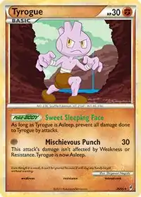 Tyrogue (Japanese: バルキー Balkie) is a Fighting-type Basic Pokémon card. It was first released as part of the HeartGold & SoulSilver expansion.