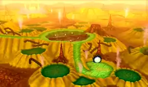 The Ultra Crater is actually a large expanse with several craters filled with a green substance. The land has what looks to be metal pipes growing as roots throughout the rock. A few red monoliths also stick out of the ground. Several geysers are also present shooting out steam. Several Celesteela are present in the ground and the world is frequented by earthquakes as Celesteela fly out of the ground and into the sky. A large mountainous expanse is pictured in the background. The sky is yellow possibly due to geothermal activity from the geysers.