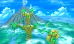 The Ultra Jungle is a large expansive jungle containing both regular trees as well as several larger trees in the shape of muscular beings flexing their upper torso and arms. These larger trees are either free standing or connected with vines the player can walk across. A river also winds between the connected trees. There is an active smoking volcano in the center of the map which erupts and spawns the initial Buzzwole.