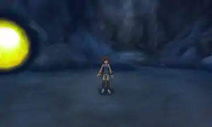 The Cave World features a path surrounded by large cave walls sloped towards an area seemingly seeped with light. The pathway leads from the yellow warp hole to where the Pokémon is located as a dirt cloud on the ground surface.