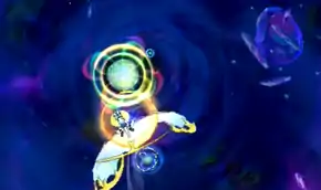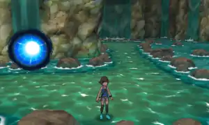 Ultra Space Wilds (Water World) (Japanese: ウルトラスペースゼロ(水の世界) Ultra Space Zero (Water World)) can be reached through blue warp holes. When a Legendary Pokémon is encountered in this area, its silhouette is first seen above the player behind a waterfall.