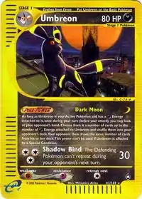 Umbreon (Japanese: ブラッキー Blacky) is a Darkness-type Stage 1 Pokémon card. It is part of the Aquapolis expansion.