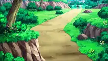 Route 1 first appeared in Enter Iris and Axew!. In the anime, it is a forest route with a small lake; mountains surround the route. There is a nearby Pokémon Center and Poké Mart. As Ash traveled through the route, he met Iris and her Axew as they were picking fruit. He tried to catch one of the Deerling native to the area, but failed. In a nearby cave, Jessie, James, and Meowth received orders from Giovanni and encountered a flock of Woobat, one of which Jessie caught off-screen. The next day, Ash encountered a flock of Pidove; the flock flew away except for only one, which Ash caught.