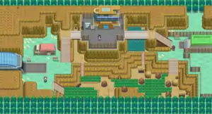 Alternatively, players can head down some stairs south of the eastern gate and through tall grass. There are two Strength boulders in this route, the southeastern one leads to an item while the northern one leads to dark grass and another item. Continuing east past the Strength boulders there is more tall grass and a narrow path up some stairs leading to a hidden item. There are three ledges in the western half of this route. One runs horizontally and must be jumped over from the north for players to continue westward through this part of the route. The other two run vertically and are eastbound. A large rock prevents players from avoiding the ledges by travelling between them.