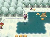 Route 8 is a route with many water puddles due to excessive amounts of rainy days. Pokémon hide in the damp ground. The puddles freeze over in winter. The route is accessible by a path to the east of Icirrus City. To the north of the first path is a small lake that can be surfed on, with tree stumps and a log in the middle which can not be crossed. After passing the lake, the route splits into two paths. The southern path leads to another small lake, and Tubeline Bridge. There is a Parasol Lady near the bridge's entrance who hands out weather condition boosting rocks based on the time of day and has a habit of speaking in rock puns. For example, she says "I'll be here, I pumice". The northern path leads to the Moor of Icirrus.