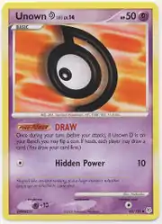 Unown D (Japanese: アンノーン D Unknown D) is a Psychic-type Basic Pokémon card. It is part of the Diamond & Pearl expansion.