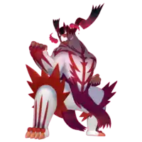 When Urshifu Gigantamaxes, the patterns on its fur become significantly accentuated, its headband lengthens, and its eyes and mouth take on a white glow. In general, parts of its fur that used to be grey are now white, and parts that used to be black are now its signature color (red for Gigantamax Single Strike Style and blue for Gigantamax Rapid Strike Style). In addition, Gigantamax Single Strike Style Urshifu's leg fur and headband become spikier, while for Gigantamax Rapid Strike Style Urshifu they become rounder and less spiky.