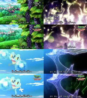 - During the scene where the protagonists' Pokémon are seen using their moves, the background scenery is less blurry and now features a rocky outcrop in the forest, along with relocated mountains.