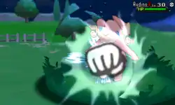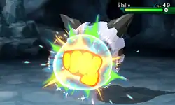 A light blue wind forms around Riolu. It then jumps in the air and fires the wind in the form of a blade, or Riolu creates a sphere of wind in its hands. Riolu then fires the wind in the form of a beam at the opponent. | ||