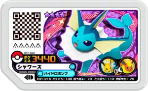 Vaporeon (Japanese: シャワーズ Showers) is a Grade 4 Pokémon Ga-Olé disk. It is part of the first Grand Rush set.