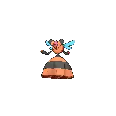 Vespiquen is a bee-like Pokémon with a typical insect-like, three-part body, i.e. divided into an abdomen, thorax, and head. It has a yellow- and black-striped abdomen, which flares out from a thin, waist-like protrusion under its thorax in a manner that resembles an elegant ballgown. Underneath the expansive abdomen are seven orange, honeycomb-like cells that serve as a nest for baby Combee; the centermost cell, however, surrounds what appears to be a slender, yellow, more insect-like abdomen, which is often obscured by the ‘gown’ part of its abdomen. Vespiquen has black arms that each consist of two thin, conical segments. Each arm ends in two small, orange claws. It flies with a pair of relatively small wings, each of which consists of two stacked, translucent teardrop segments. Vespiquen's arms and wings attach to its round thorax, which is yellow on the front, black on the back, and orange on each side where its arms attach. A curved line on its back, between its orange shoulders, separates its thorax and waist. Vespiquen's head consists of its face and horns. Its orange face has intimidating red eyes; yellow mandibles that protrude from its face and connect to its horns; and a large, red gem on its forehead. Vespiquen's horns are yellow close to its face and black at the tips, and with the gem, they resemble historical headpieces or crowns worn by European royal and noble women in the Late Middle Ages, such as the Escoffion.