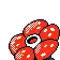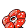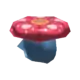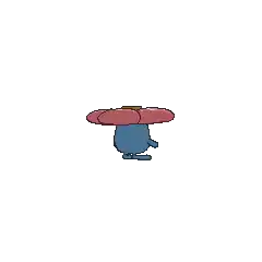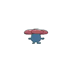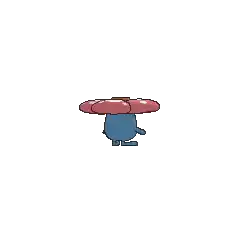 Vileplume is an indigo, bipedal Pokémon with rudimentary hands and feet. It has beady red eyes and a small mouth, and its head and torso are a single joined segment. On its head is a massive red flower with five bulky petals and an orange-brown center. Vileplume's flower is said to have the largest petals in the world and is almost too heavy for the Pokémon itself to support. The rounded petals of the flower are red and covered with white spots. A female Vileplume has fewer, but larger, spots on its petals.