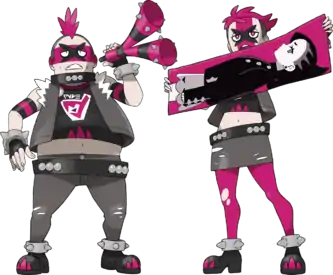 Team Yell is the villainous team of the Galar region. The grunts' black-and-pink uniforms are inspired by football hooligans and punks; and consist of sneakers, pranks, tank tops, vests, and gloves. Many of their clothing articles are ripped/torn or embellished with spikes and studs. The grunts also wear face paint and dyed or painted hair. Their symbol is a stylized, upside-down Y, forming an eye tattoo or a claw, though it also closely resembles their signature Y-shaped vuvuzela. In reality, Team Yell grunts are Spikemuth Gym Trainers in disguise, under their captain and Gym Leader Piers.