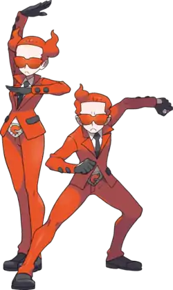 Team Flare is the villainous team of the Kalos region. The grunts' uniform is a mafia styled red suit, while Admins wear more stylized white suits and Scientists wear red suits of varying designs. Their leader is Lysandre. Their symbol is a flaming letter F.