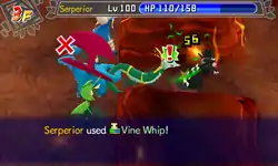 | Two green vines the same color as Serperior's collar come out from in between its collar and its neck and hit the opponent one after the other. | |||