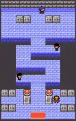 In Generation II, the Gym structure is very basic. It is very similar to Pewter Gym in layout, a pathway leading directly to the Gym Leader with two Trainers obscuring the way. The path is held on some sort of raised platform, with a seemingly bottomless pit left and right of the path. The path creates an "S" shape as it winds around toward the Gym Leader. At the tips of the "S" there are two Trainers that are both unavoidable. At the end stands Falkner, who will battle any challengers of the Gym. After Falkner is defeated, he will give the player the Zephyr Badge, which allows the use of Flash outside of battle, as well as TM31 (Mud-Slap).