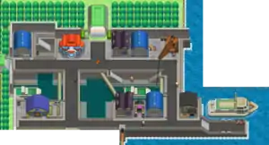 Virbank City is shown to be a port city with many hangars, docks and waterways. In the northeastern part of the city, there is graffiti painted on the wall that resembles Koffing's skull and crossbones mark.