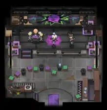 The Virbank Gym is designed as an underground music club. Upon entering, the player will have to go down some stairs and enter the club, where Roxie and her band are performing on the stage. The club also doubles as a place for bands to form, as posters fill the walls next to the staircase, and one of them notes a vocalist in the search of the rest of a band. The Gym has a large stage with a picture of a Koffing made out of graffiti on it, chairs and tables, a bar, and a booth for a DJ. The puddle Roxie stands on is made of purple goop. Trainers must battle Roxie's two band members before she will battle them.