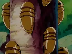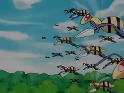 The forest was also the setting of the following episode. While traveling through the forest, Ash spotted a Weedle and decided to catch it. He used Pidgeotto against it, but another Trainer named Samurai arrived on scene and challenged Ash to a battle. Meanwhile, the Weedle escaped and Samurai rebuked Ash for it. The two then engaged themselves in a Pokémon battle, which got stuck for hours as their Metapod were unable to do anything but use Harden. All of a sudden, a swarm of Beedrill arrived and carried Ash's Metapod away. Samurai took Ash, Misty and their other Pokémon to a safe place, but not before running into group of Kakuna which promptly evolved and attacked them. The next day, Ash went and saved his Metapod from under the very same tree, having noticed him there the day before. Due Team Rocket's loud entrance, the Beedrill woke up and started chasing Ash. He apologized to Metapod for leaving him in trouble like that, after which he saved his Trainer from a Beedrill's Twineedle attack. Afterwards, he quickly evolved into a Butterfree and saved Ash, Misty, and the samurai by putting the Beedrill asleep with Sleep Powder. At the end of the episode, Ash and Misty left Viridian Forest.