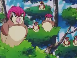 Later in the original series, Ash released his newly evolved Pidgeot near Viridian Forest in Pallet Party Panic. As the group went through Viridian Forest, Ash and his friends were attacked by a flock of Spearow. The flock's leader was a Fearow, which apparently evolved from the Spearow that Ash hit with a rock on the first day of his journey. Ash climbed a tree to escape and found Team Rocket with a flock of Pidgey and Pidgeotto who were in a turf war with the flock of Spearow. After sending Team Rocket falling from tree as a bait for the Spearow, Ash sent out his own Pidgeotto to tell the other bird Pokémon that it was safe to leave. The Fearow then came back, however, and started attacking bird Pokémon. Ash's Pidgeotto tried to fight the Fearow, but was badly hurt. Instead of giving up, however, it then evolved into a Pidgeot. Pidgeot and Pikachu then teamed up to defeat the Fearow and its minions. Ash also tried to catch the Fearow but failed, forcing them just to chase it away. Ash decided to leave Pidgeot in the forest to look after the Pidgey and Pidgeotto.