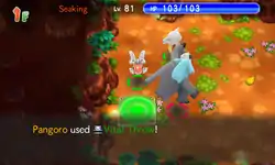 In Red Rescue Team and Blue Rescue Team, Explorers of Time, Darkness and Sky, and the Mystery Dungeon (WiiWare) games, Vital Throw is a non-damaging move with 12PP. Pokémon using Vital Throw will gain the Vital Throw status. A Pokémon that directly inflicts damage on a Pokémon with the Vital Throw status is sent flying, usually towards the other side of the room. Due to being a status move, it is now affected by Taunt.
