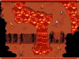 There are two entrances into the volcano, one to the west and another on the eastern side. The east entrance is locked until the player arrives to secure the Red Gem, at which point the village elder unlocks it and permits entry. There are many Fire and Rock-type Pokémon living inside the cave. As the cave is inside a volcano, there is lava everywhere and the primary method of getting around is either by being carried by Drifloon (west entrance) and Drifblim (east entrance) or by riding on Torkoal.