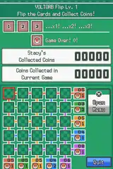 Flipping a multiplier card will give the player that many coins on the first card, or multiply the total by the number flipped for all subsequent flips. Higher levels have more multiplier cards, therefore producing larger payouts. Flipping a Voltorb will cause the player to lose all coins earned during the current string of multipliers. Flipping a Voltorb also ends the game. If the player flipped fewer multiplier cards (including ×1 cards) before the Voltorb than the current level number, they drop down to the level equal to the number of multiplier cards flipped. For example, flipping fewer than two cards will cause the player to regress to level 1. At any time, the player can Quit instead of flipping more cards to end the game and permanently keep earned coins (though the level drop down rule still applies); doing so counts as a loss in terms of the next round. The player wins and advances one level by finding all of the ×2 and ×3 multiplier cards. Winning or Quitting, as before, will earn the player Coins, which can be traded for prizes. Level 8 is achieved by winning five games in a row of any level having flipped eight or more multiplier cards in each of these five games (in the fifth game, you can Quit having flipped eight or more multiplier cards and still advance to level 8). Exiting the game will reset the player to level 1.