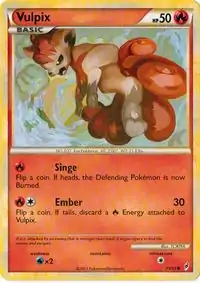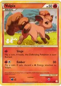 Vulpix (Japanese: ロコン Rokon) is a Fire-type Basic Pokémon card. It was first released as part of the HeartGold & SoulSilver expansion.